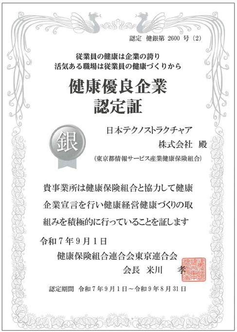 当社は、健康保険組合連合会東京連合会に「健康企業宣言」を行い、働きやすい環境整備と従業員の健康づくりへの取り組みを行っている企業として認定され、昨年度に引き続き、2025年9月1日付けで健康優良企業「銀の認定」を取得しました。